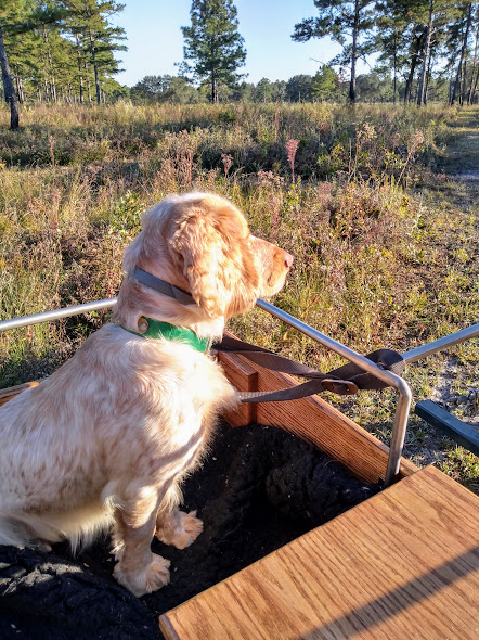 These young pups have picked up the art of finding birds with amazing quickness. It must be in their genes. But they have helped me appreciate the talent of Joy, my original wagon-dog, who died in December 2020 at the age of fifteen. These young dogs don’t release the bird into my hand like Joy did. They want to hang on to their prize. And, unlike Joy who would never leave until called, they must be clipped to the wagon, so they don’t rush out and spoil the hunt.
