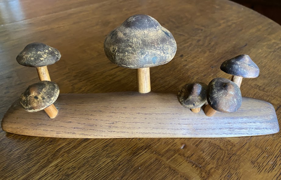 My dad’s spores arrived by mail in a small plastic bag. They were a pressed sawdust product that had been infused with spores and molded into one-inch-long plugs that fit neatly into a quarter-inch, round hole. My brothers and I were charged with drilling hundreds of holes into a pile of four-foot-long, hardwood logs. After we had hammered the spore-plugs into the holes, we took the logs to the back of the cabin where dad dropped them into an old bathtub filled with water. He weighted them with some cement blocks to soak for a day or two then stood them up against the back of the cabin in the moist shade to germinate. I don’t remember how long it was before he had mushrooms, but the end product was both dramatic and delicious. He freeze dried his harvest and kept the mushrooms in shrink-wrapped bags. The only visual evidence I have of dad’s mushroom production is a woodcarving I gave him for Christmas in 1995.