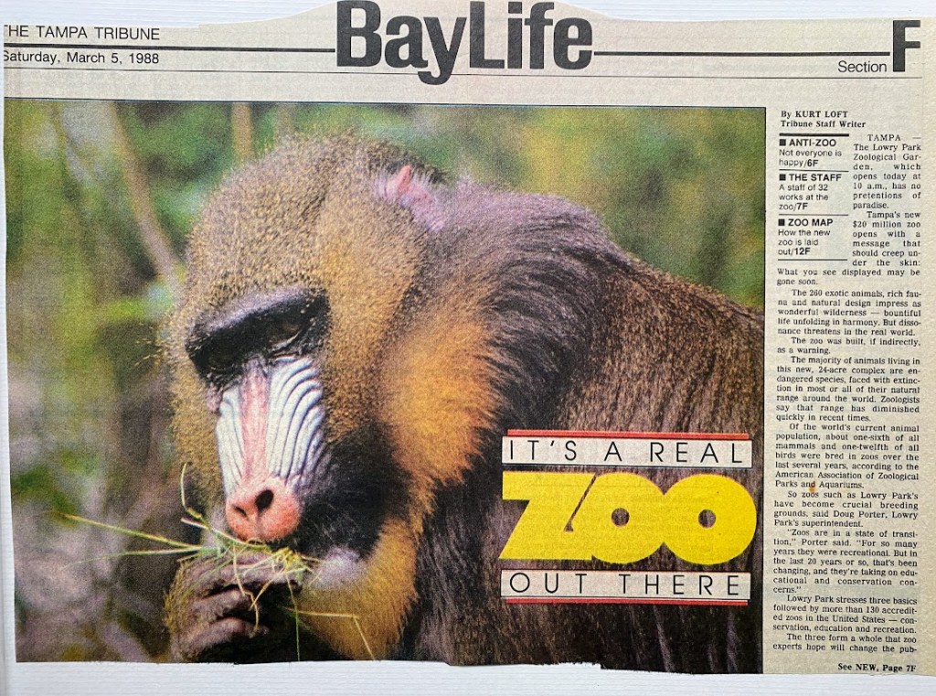It was Saturday, March 5th, 1988, thirty-six years ago tomorrow, that Tampa’s Lowry Park Zoo re-opened after a 3-year closure for renovation. I remember the date because I was the zoo director. When I arrived in 1984, the zoo was what I described in my memoir, Lessons from the Zoo, as a “grim place” with chain-link cages and water-filled pits. When I left, four years later, we had raised $20 million to rebuild the entire 24-acre zoo from the ground up. If it had been a home renovation, it would have been called a “tear down”. Along the way, we earned accreditation from the Association of Zoos and Aquariums, we hosted Jane Goodall, and, when we were finished, the animals were walking on grass in natural habitats. It was well on the way to becoming the ZooTampa at Lowry Park of today.