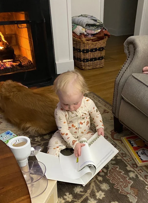 But today, it is your words that interest me. After months of pointing very deliberately at nothing in particular and verbalizing sounds that may or may not have sounded like car or dog or dad, you have begun to purposefully and in context repeat words like bye-bye, outside, all done, ball, and (most telling) no no no. You have also begun to appreciate the written word when you pull books from your bookshelf and turn pages by yourself.